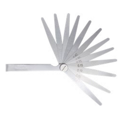В набор входит 20 стальных пластин (листьев) длиной 100 мм, покрывающих диапазон толщин от 0,05 до 1 мм, что делает комплект универсальным для большинства измерительных и сервисных задач