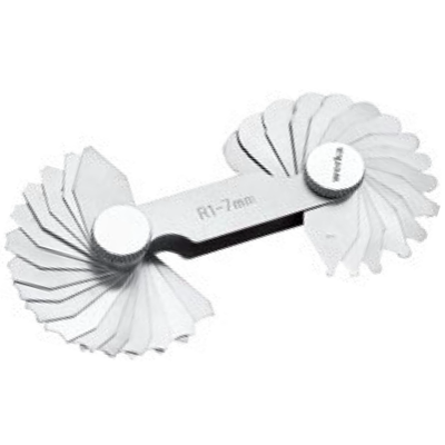 Комплект включает шаблоны радиусов от 1 до 7 мм (17 шт.), выполненные в двух формах — выпуклые и вогнутые (Concave and Convex shaped blades), что делает инструмент универсальным для измерения как внешних, так и внутренних радиусов
