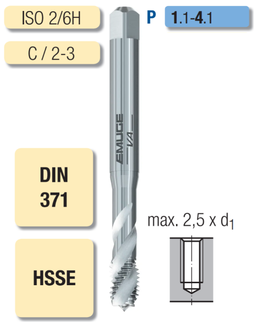 Метчик B0503000.0100 от EMUGE FRANKEN — это высококачественный инструмент для нарезания метрической резьбы M10x1.5 (ISO2/6H). Изготовлен из быстрорежущей стали кобальтового класса HSSE, оснащён спиральными канавками под углом 35°, что обеспечивает надёжный отвод стружки при работе в сквозных отверстиях.