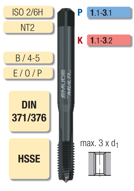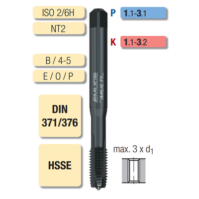 Метчик B5207300.0040 Rekord 1A-MULTI-NT2 от EMUGE FRANKEN предназначен для нарезания метрической резьбы M4x0.7 (ISO2/6H). Изготовлен из быстрорежущей стали с кобальтом (HSSE), оснащён прямыми стружечными канавками. Подходит для работы с материалами групп P (стали) и K (чугуны) .