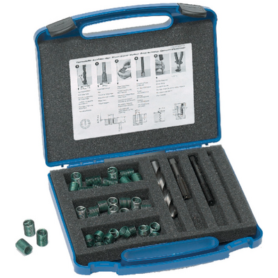 Набор HELICOIL 4185 105 0000 (139831 M5) предназначен для восстановления или усиления резьб M5 × 0,8. В комплект входят «плюс» вставки (HELICOIL® Plus) трёх длин, соответствующие инструменты. Набор позволяет быстро исправить повреждённую резьбу с минимальным вмешательством.