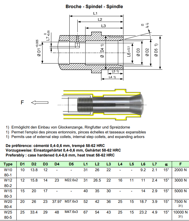 Корпус серии W имеет наружную резьбу (pull-type collets) и допускает широкий диапазон зажимных диаметров, в том числе очень мелкие, с точностью изготовления и совместимостью с патронами Schaublin.