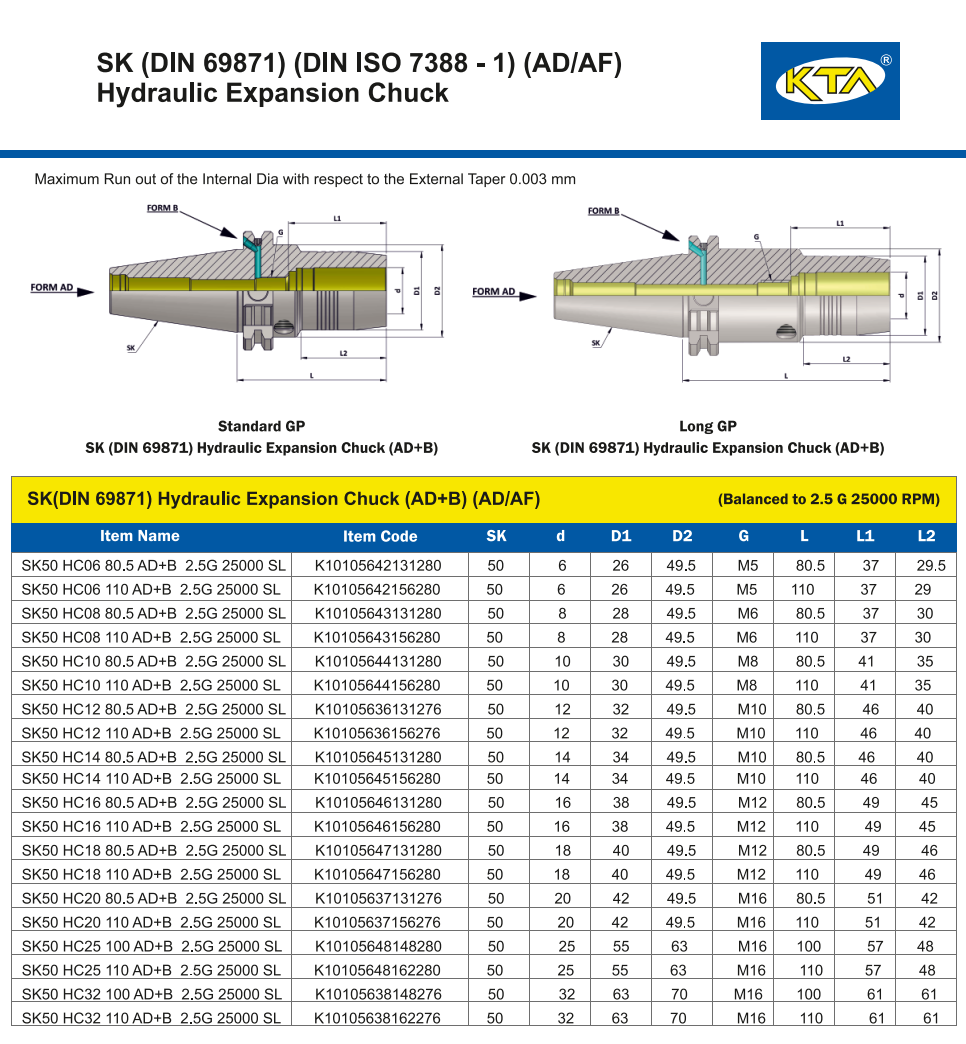 K10105638162276 SK50 HC32 110 AD+B 2.5G 25000 SL — это гидропластовый патрон KTA с конусом SK50, предназначенный для надежного крепления инструмента с цилиндрическим хвостовиком диаметром 32 мм. Обеспечивает высокую точность, стабильность и минимальное биение при высоких оборотах до 25 000 об/мин. Идеален для фрезерных и обрабатывающих центров, где требуется высокая жесткость и балансировка.