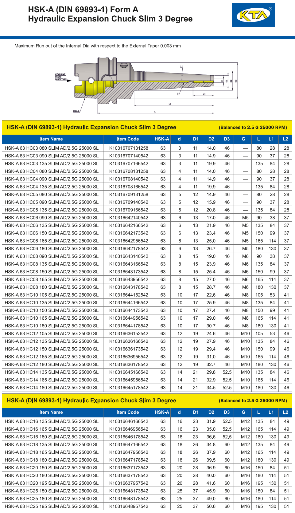 Патрон гидропластовый KTA K10316636173542 HSK-A 63 HC12 150 SLIM AD+B/2.5G 25000 SL