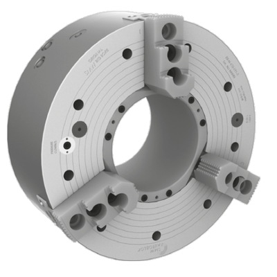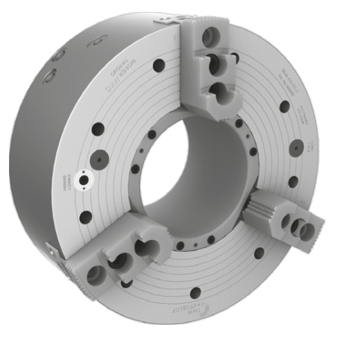 Механизированный пневматический трёхкулачковый патрон для зажима труб и полых заготовок с увеличенным проходным отверстием. Предназначен для обработки длинных труб с полным использованием прохода шпинделя. Обеспечивает стабильный внешний и внутренний зажим при токарной обработке на станках с ЧПУ в серийном и тяжёлом производстве.